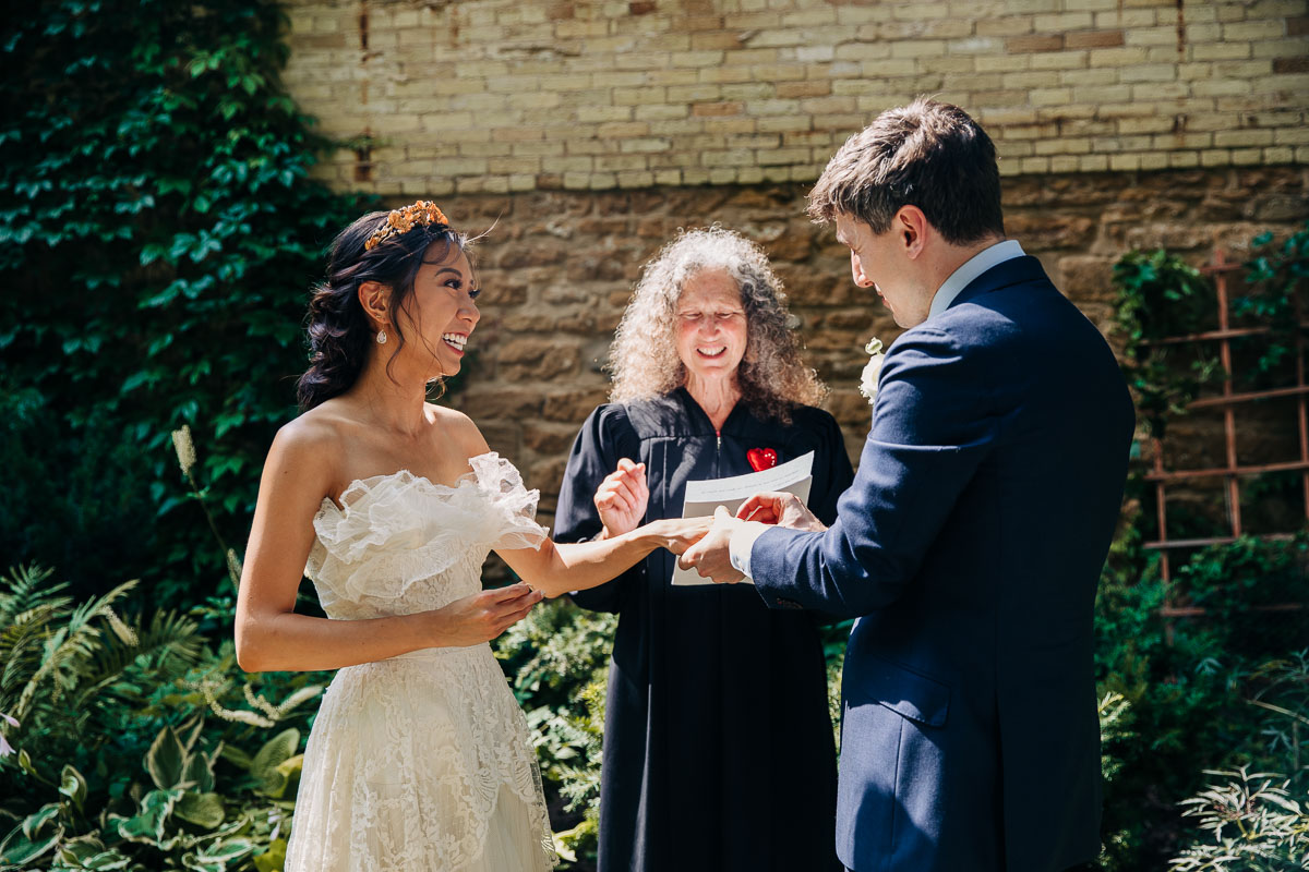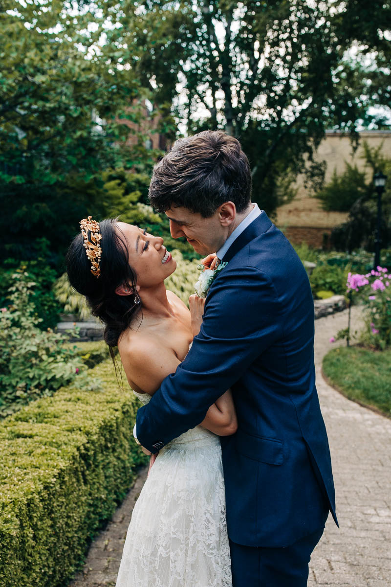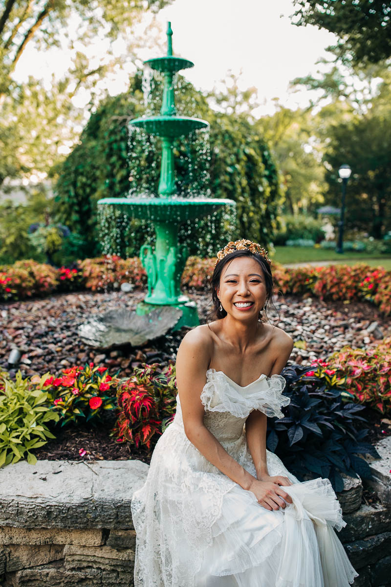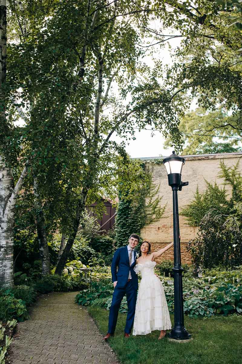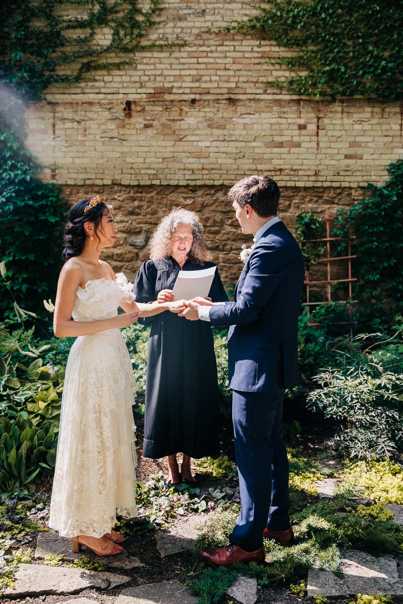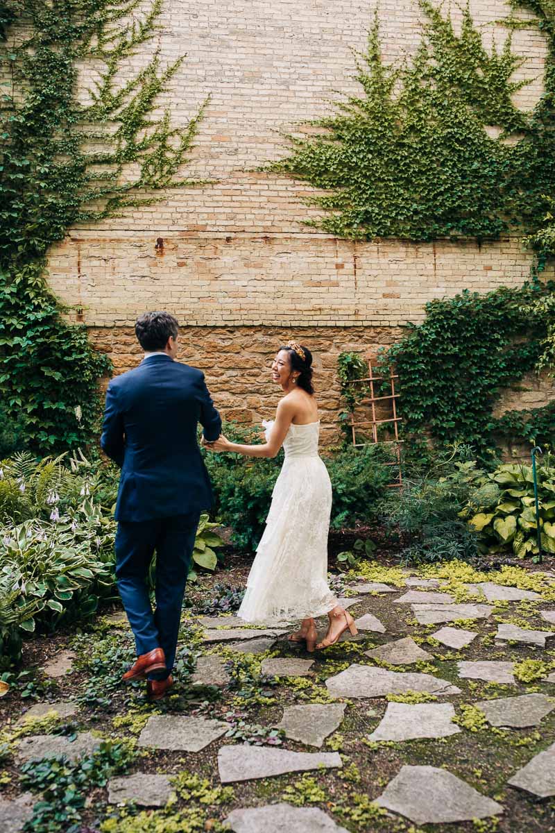 The couple below decided to celebrate their nuptials with an elopement on a Wednesday afternoon in July. The ceremony was held at the ever-beautiful Period Garden Park, located in the Mansion Hill District of downtown Madison, Wisconsin. This Victorian-era neighborhood city park is the perfect backdrop for couples seeking serene, lush gardens and beautifully manicured shrubs as well as a lovely fountain. The ceremony was held in the garden’s courtyard and featured an ivy covered cream city brick wall….my favorite! One interesting fact to note is that this park is tended by volunteers… what a beautiful oasis in the center of the city!